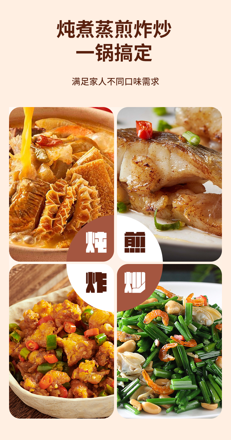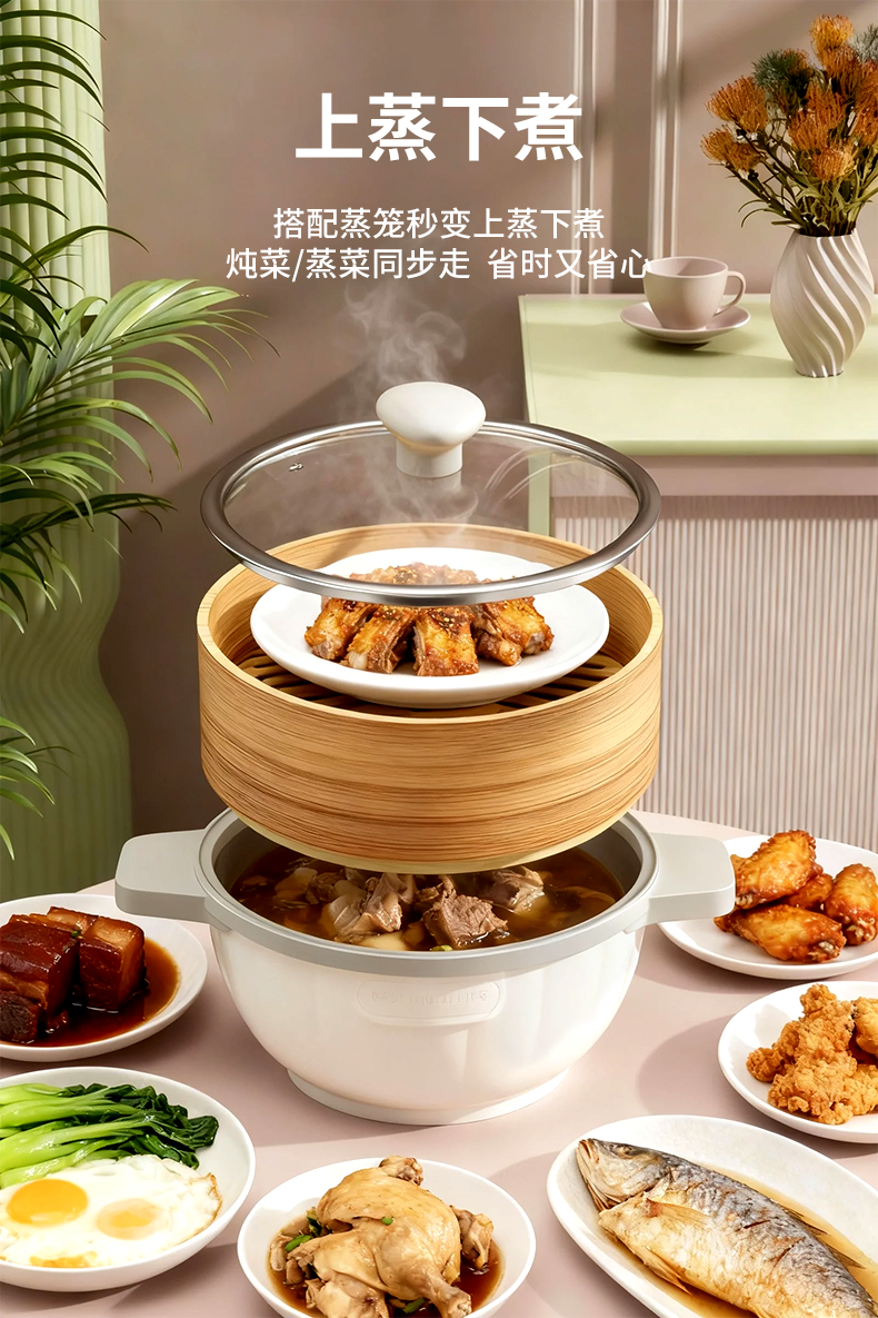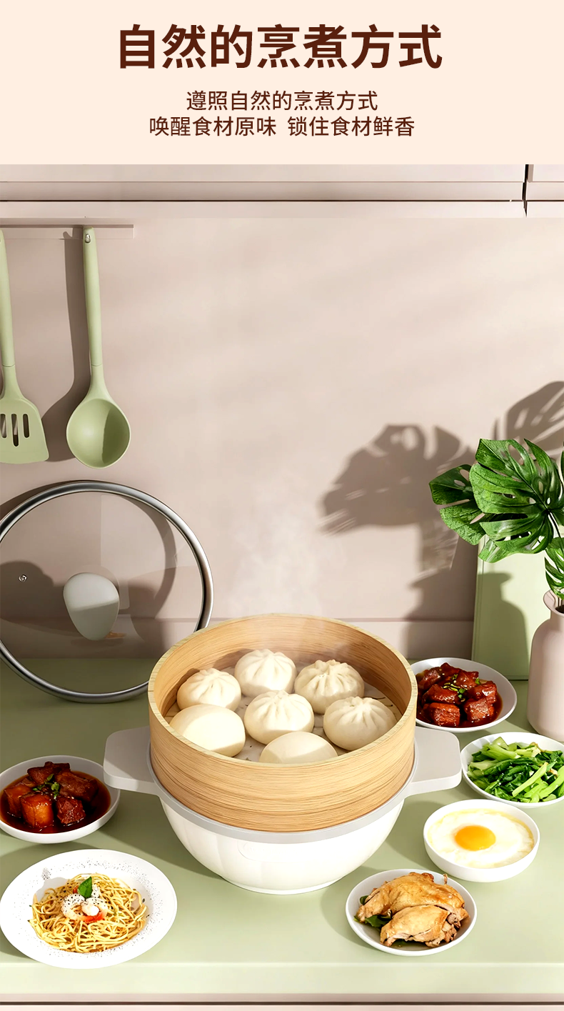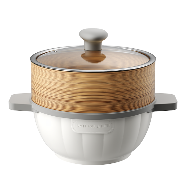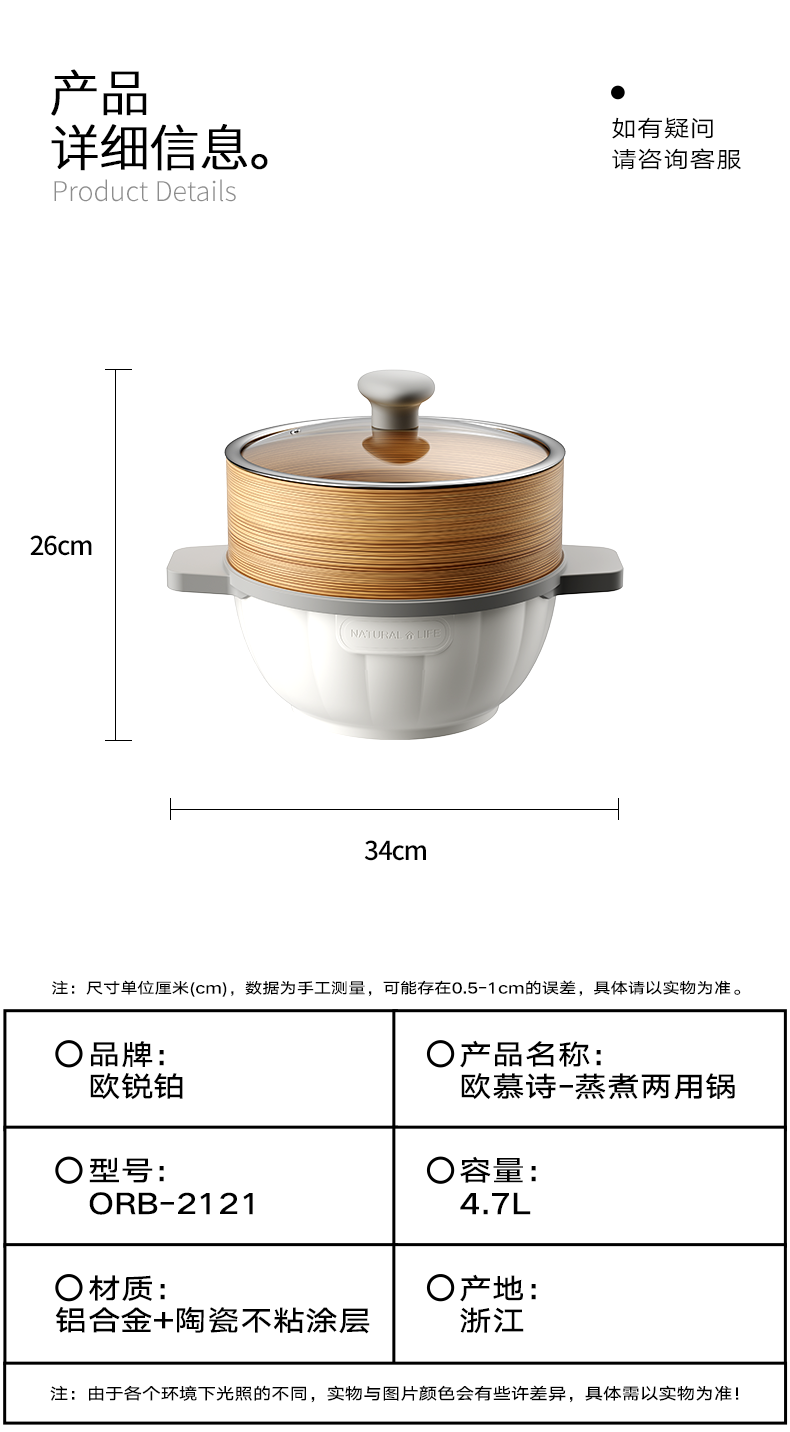蒸煮焖炖,为现代家庭饮食习惯而生,满足家人不同口味需求, 匠人陶艺、天然竹丝编织工艺,铝压铸欧式纹理成就食器之美, 4.7L大容量,满足一家需求, 搭配蒸笼秒变上蒸下煮,炖菜/蒸菜同步走,省时又省心, 遵照自然的烹煮方式, 唤醒食材原味,锁住食材鲜香, 多层导磁复底,受热均匀,不挑灶具, 陶瓷不粘涂层让烹饪升级,不沾不糊,清洗一抹即干净, 食品级硅胶包边防爆玻璃盖,密封性好,不伤锅沿,炖煮时不用揭盖。