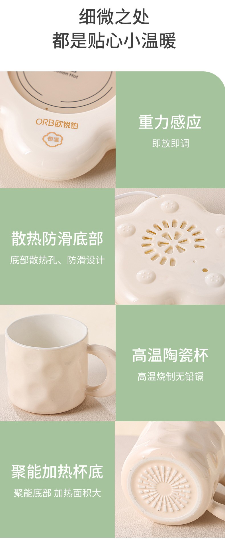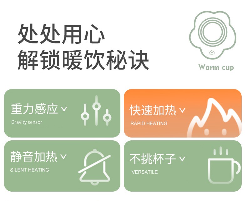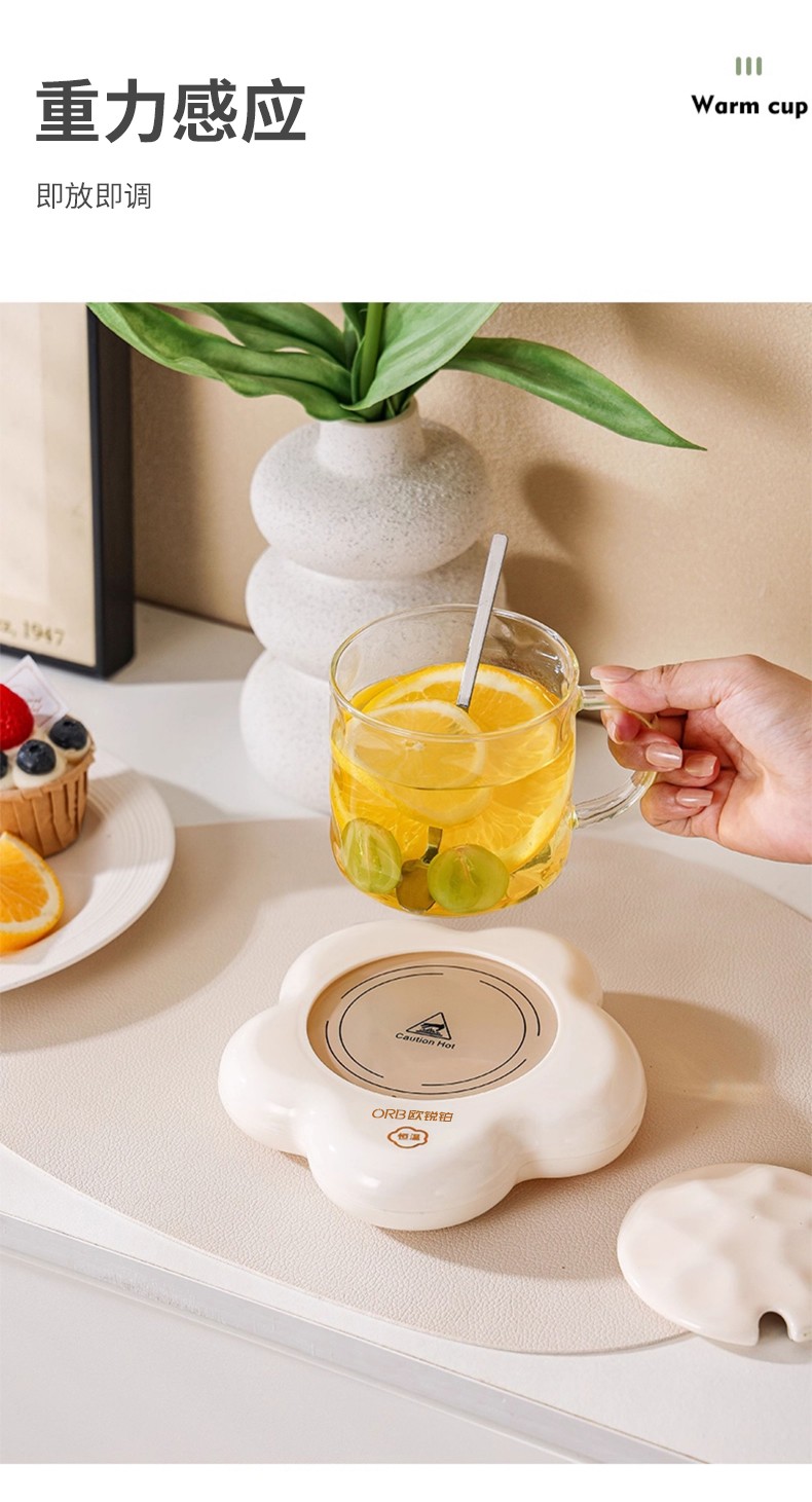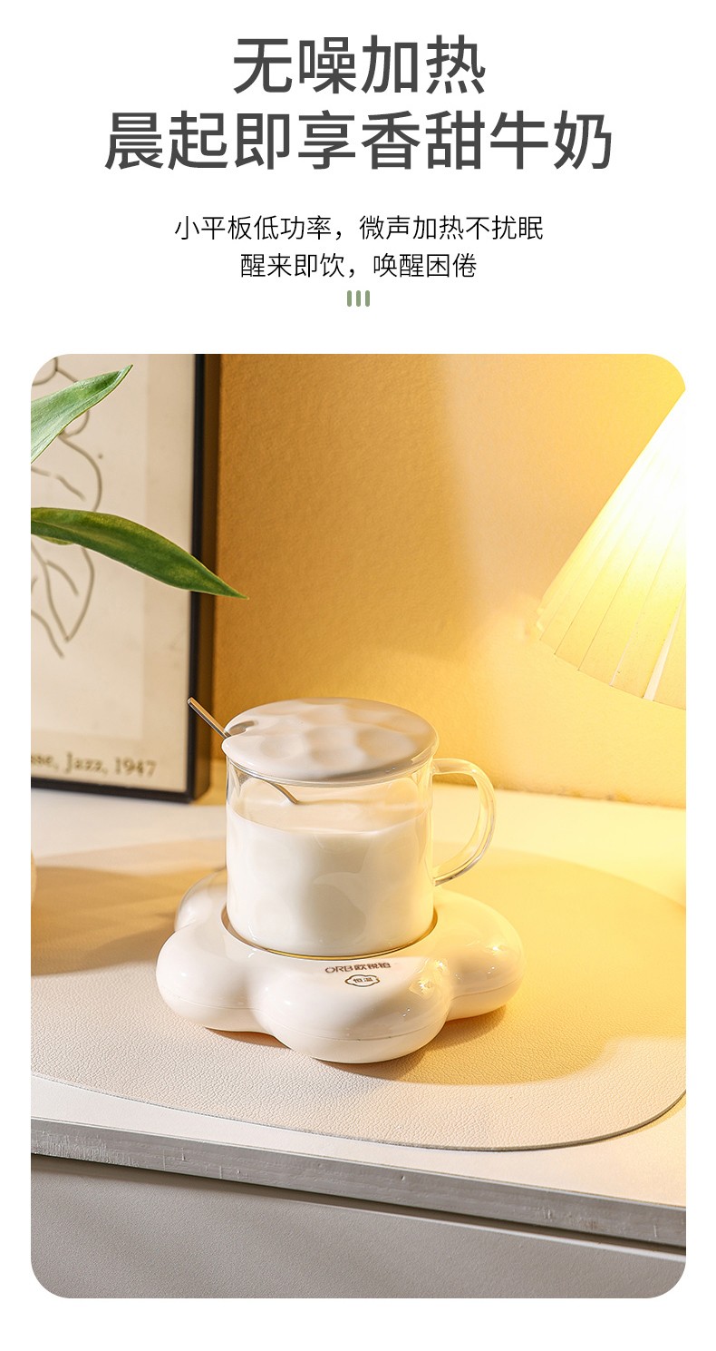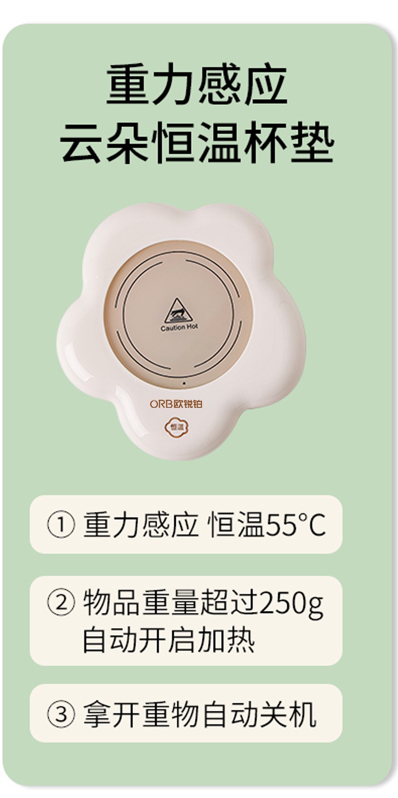 长时55°C恒温保暖,温暖近在手边,照料每个生活瞬间, 百搭不挑杯,兼容不同款式和材质的杯型, 万物皆可温,既能暖饮,也能暖物, 硅胶体发热膜面板,整圈发热,均匀恒温, 巴掌大小平板设计,角落轻松容下,温暖触手可及, 重力感应,物品重量超过250g自动开启加热,拿开重物自动关机, 静音加热不扰眠,底部散热孔+防滑设计, 配高温陶瓷杯,高温烧制无铅镉。