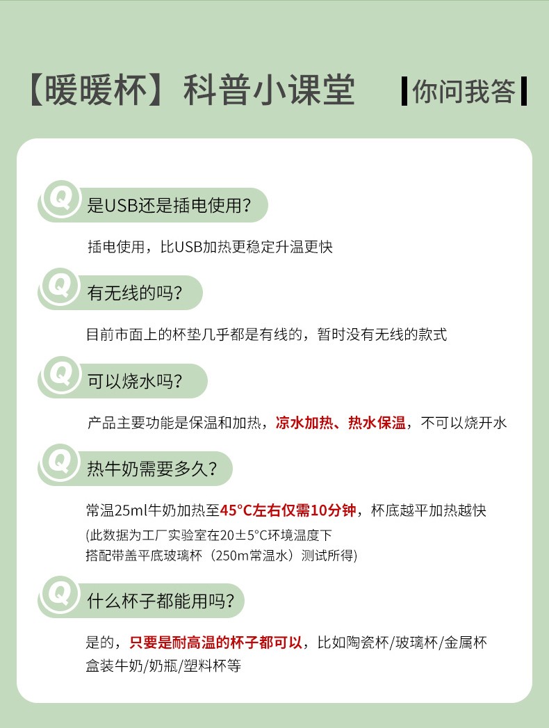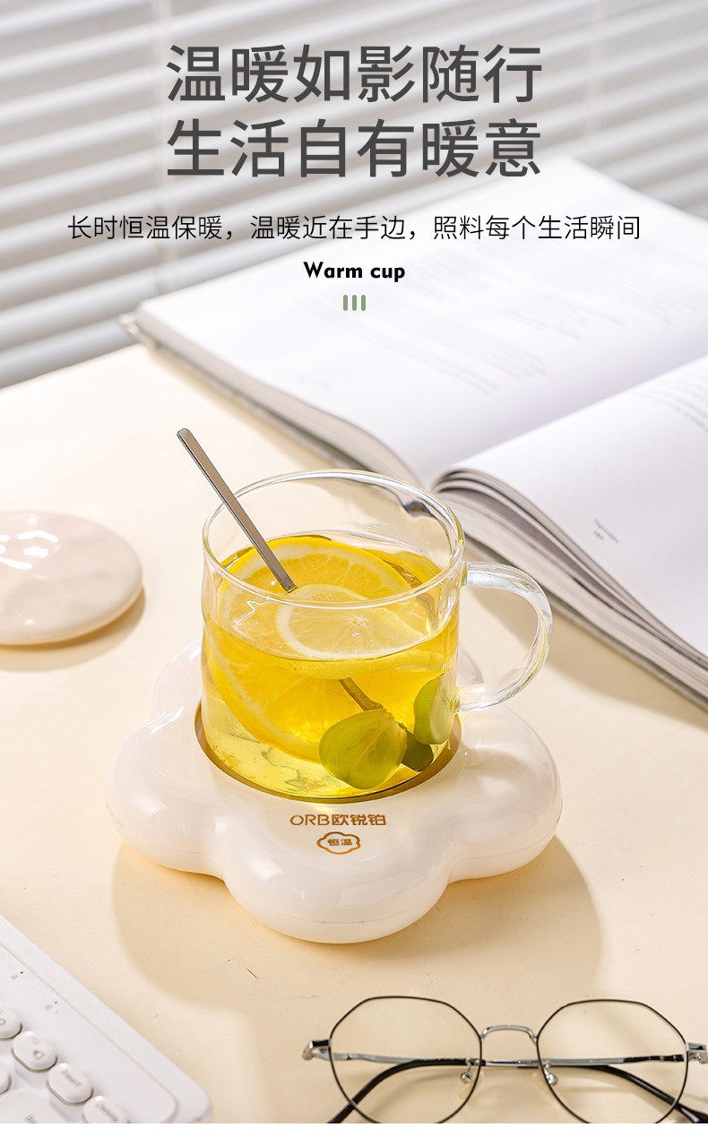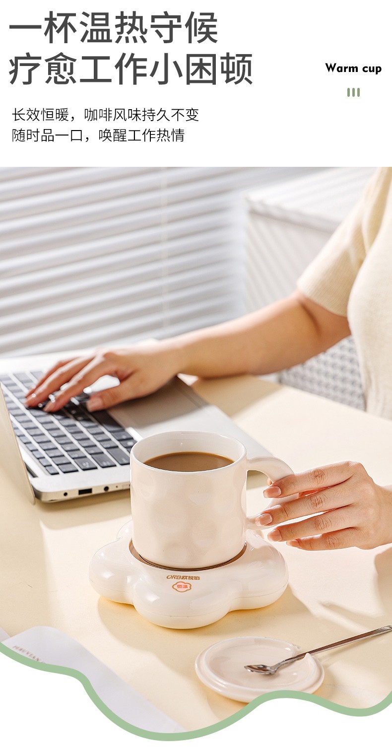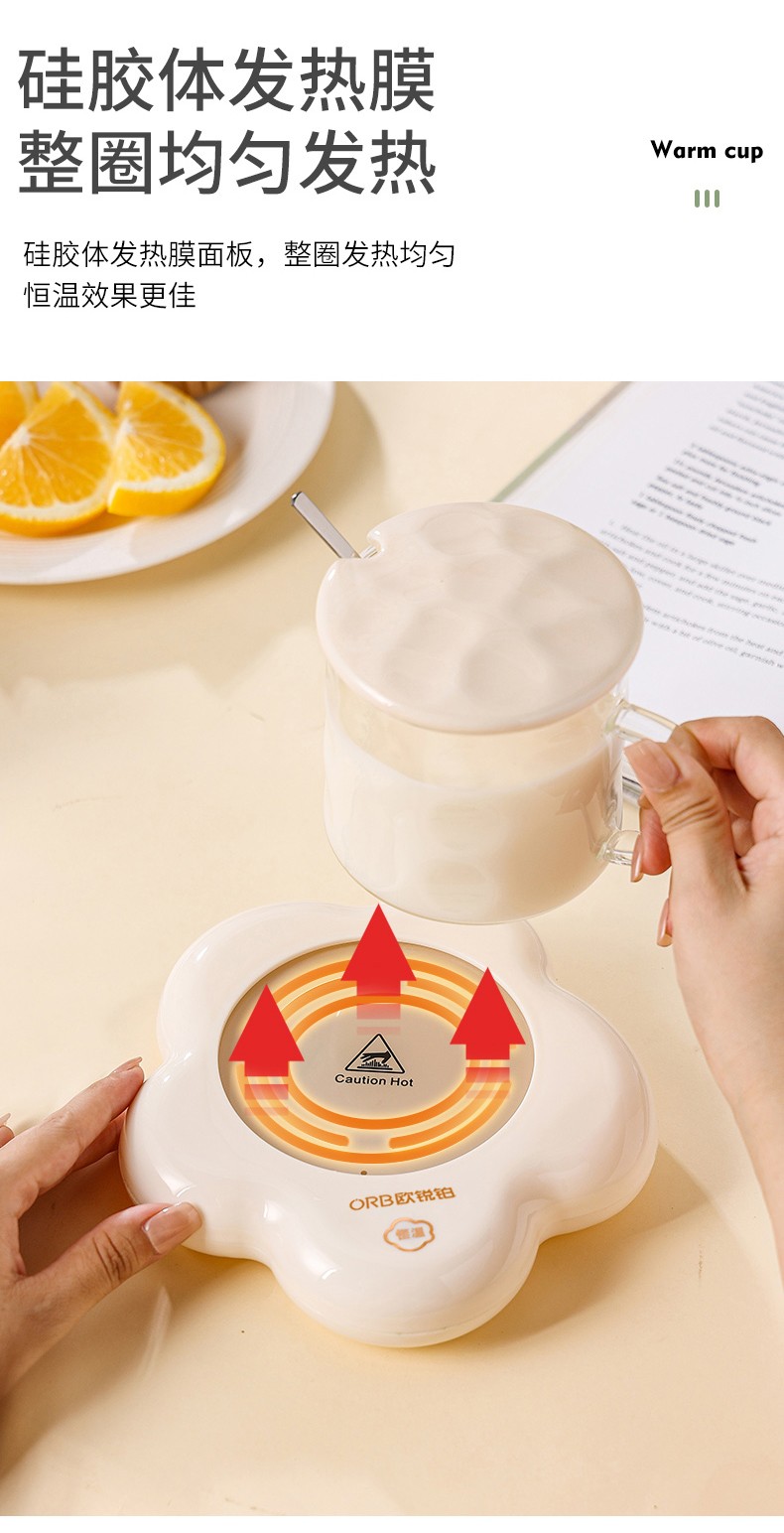 长时55°C恒温保暖,温暖近在手边,照料每个生活瞬间, 百搭不挑杯,兼容不同款式和材质的杯型, 万物皆可温,既能暖饮,也能暖物, 硅胶体发热膜面板,整圈发热,均匀恒温, 巴掌大小平板设计,角落轻松容下,温暖触手可及, 重力感应,物品重量超过250g自动开启加热,拿开重物自动关机, 静音加热不扰眠,底部散热孔+防滑设计, 配高温陶瓷杯,高温烧制无铅镉。