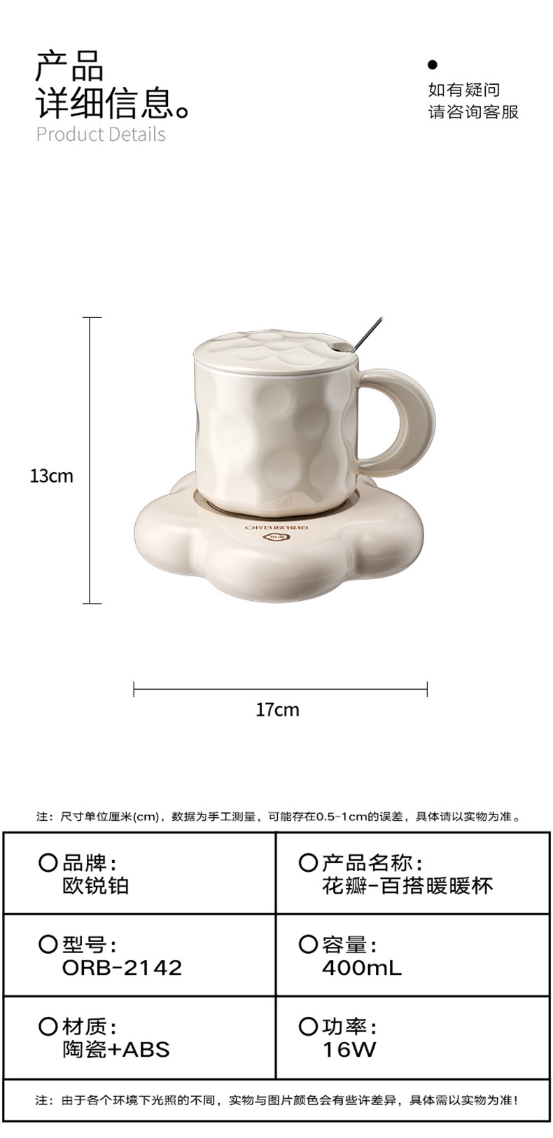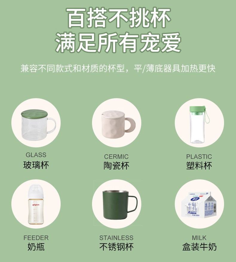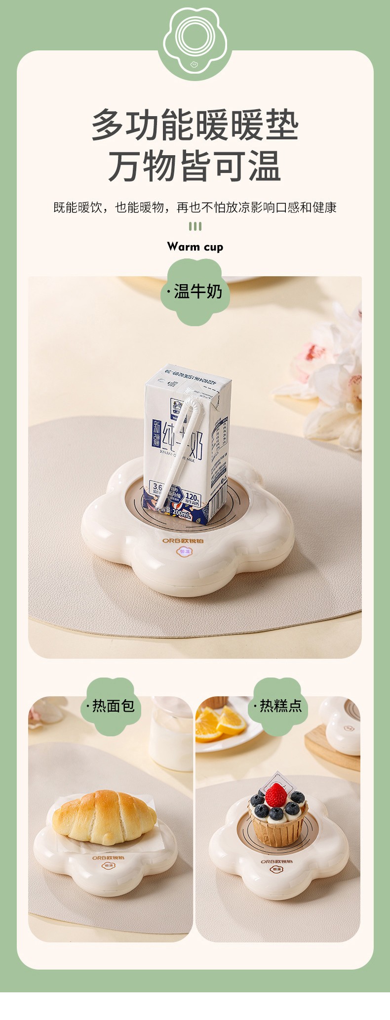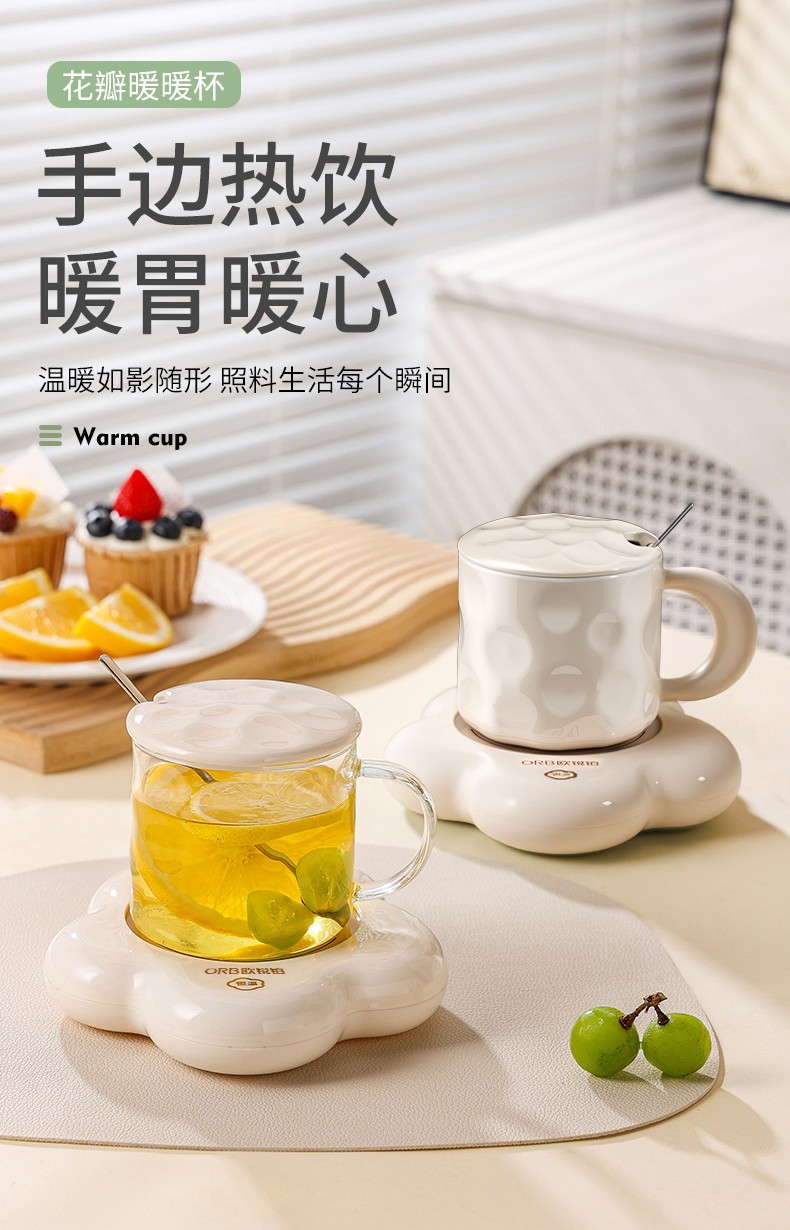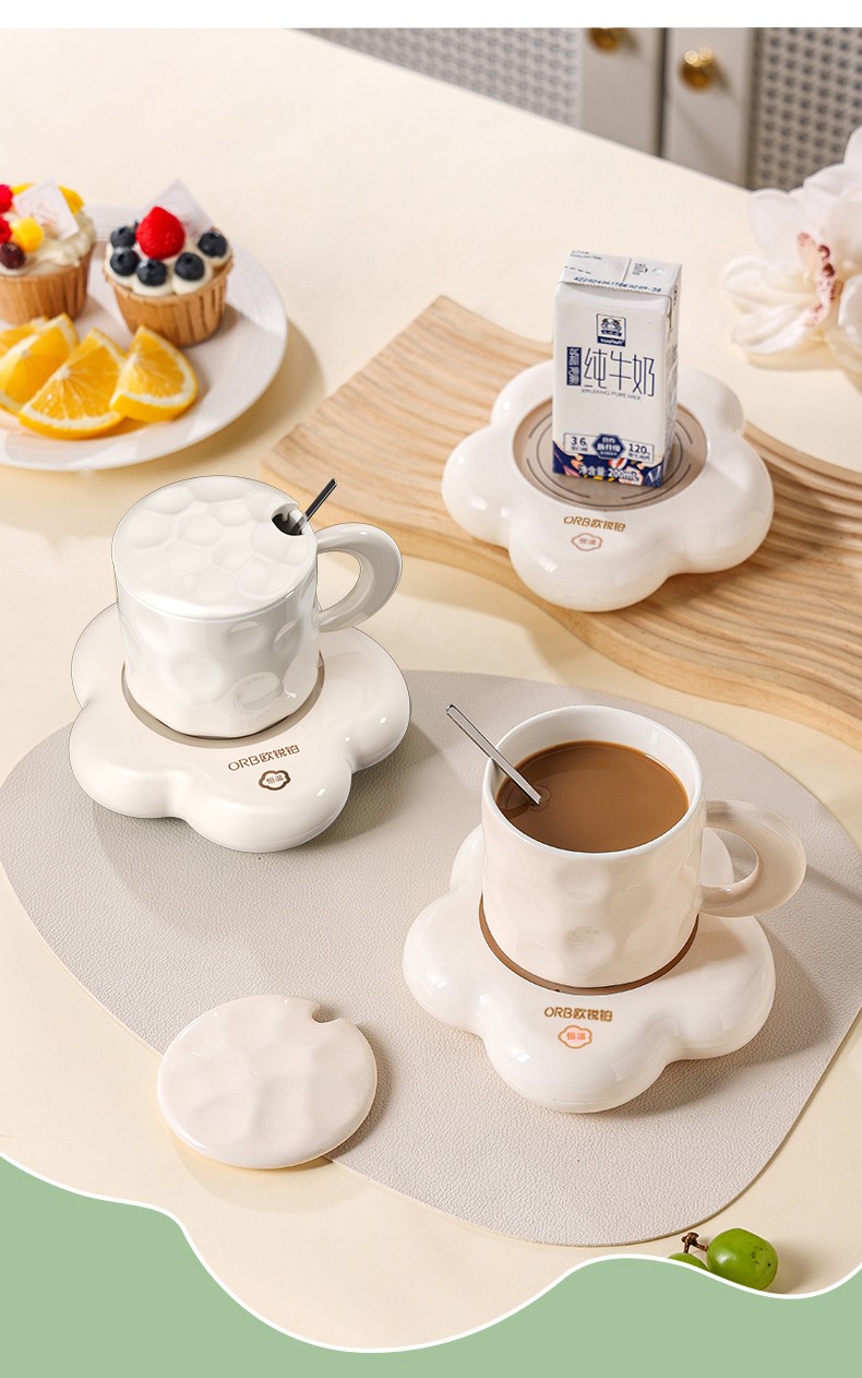 长时55°C恒温保暖,温暖近在手边,照料每个生活瞬间, 百搭不挑杯,兼容不同款式和材质的杯型, 万物皆可温,既能暖饮,也能暖物, 硅胶体发热膜面板,整圈发热,均匀恒温, 巴掌大小平板设计,角落轻松容下,温暖触手可及, 重力感应,物品重量超过250g自动开启加热,拿开重物自动关机, 静音加热不扰眠,底部散热孔+防滑设计, 配高温陶瓷杯,高温烧制无铅镉。