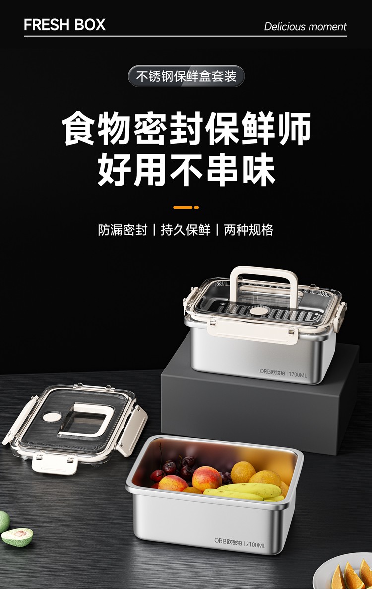 食物密封保鲜师,一盒一物独立分装,好用不串味; 负压低氧微真空,降低氧气含量,避免灰尘和潮气进入; 降低食物氧化滋生细菌的风险; 严选不锈钢材质,有效抑菌防霉,延长保鲜; 加厚可视PP盖耐冻不易变形; 内置硅胶密封圈实现360°全方位防漏; 可电陶炉加热低温高热,可入烤箱和蒸箱,自由切换; 1700ml+2100ml容量,可堆叠收纳。