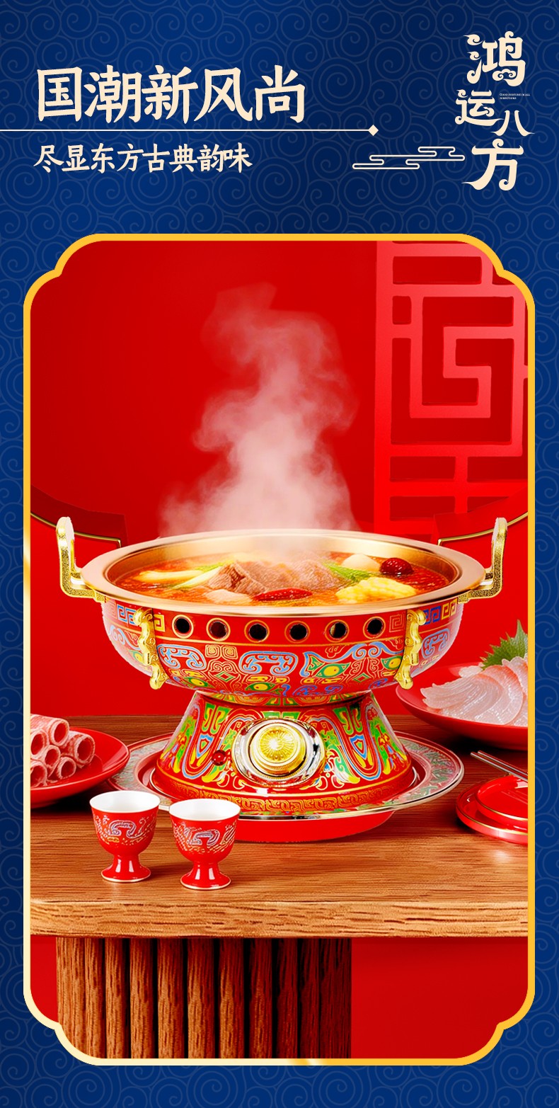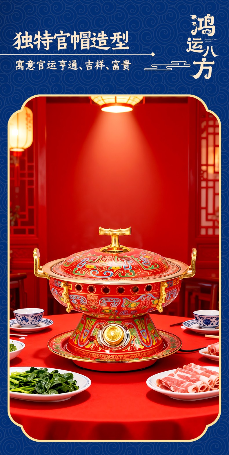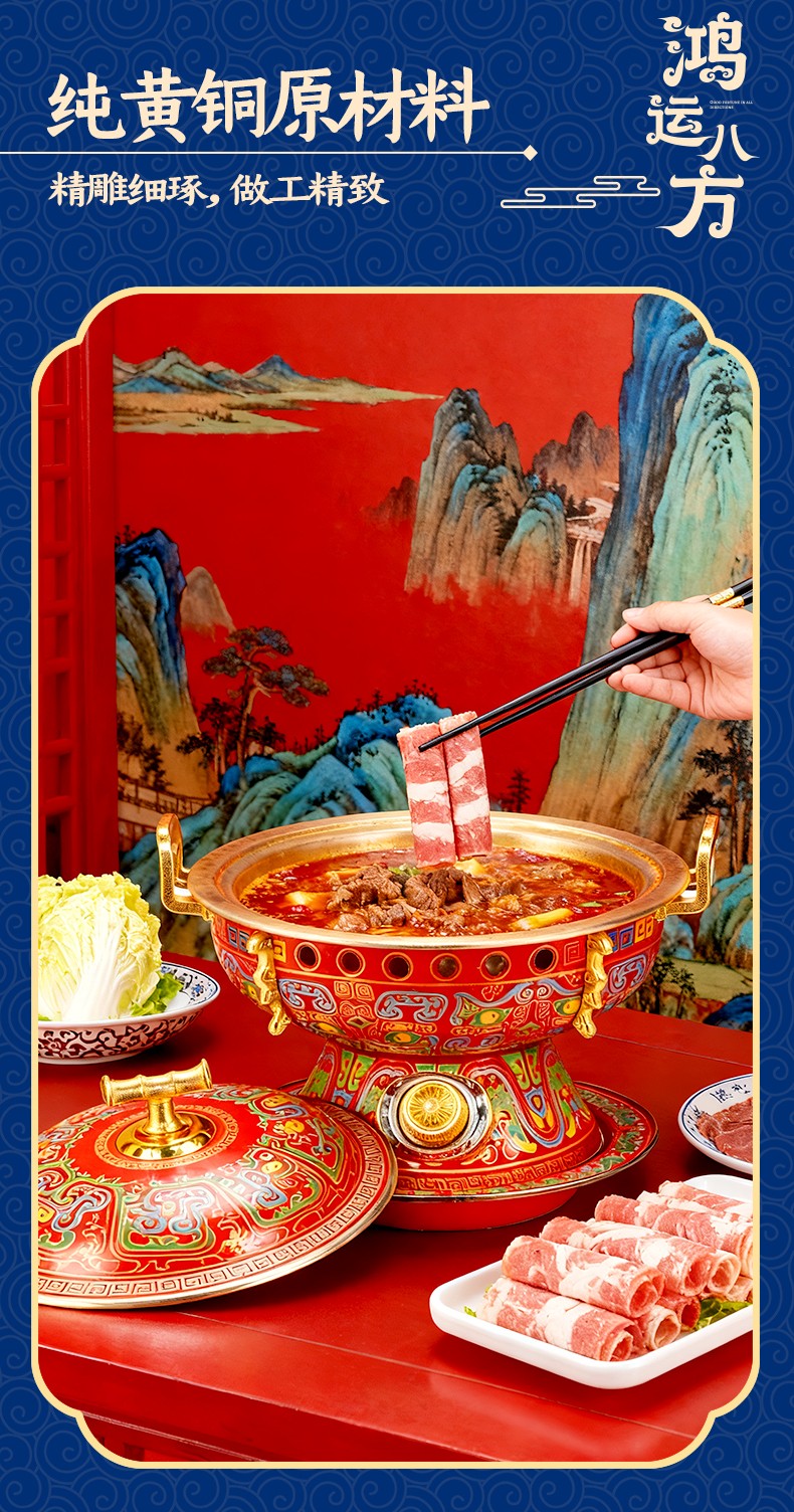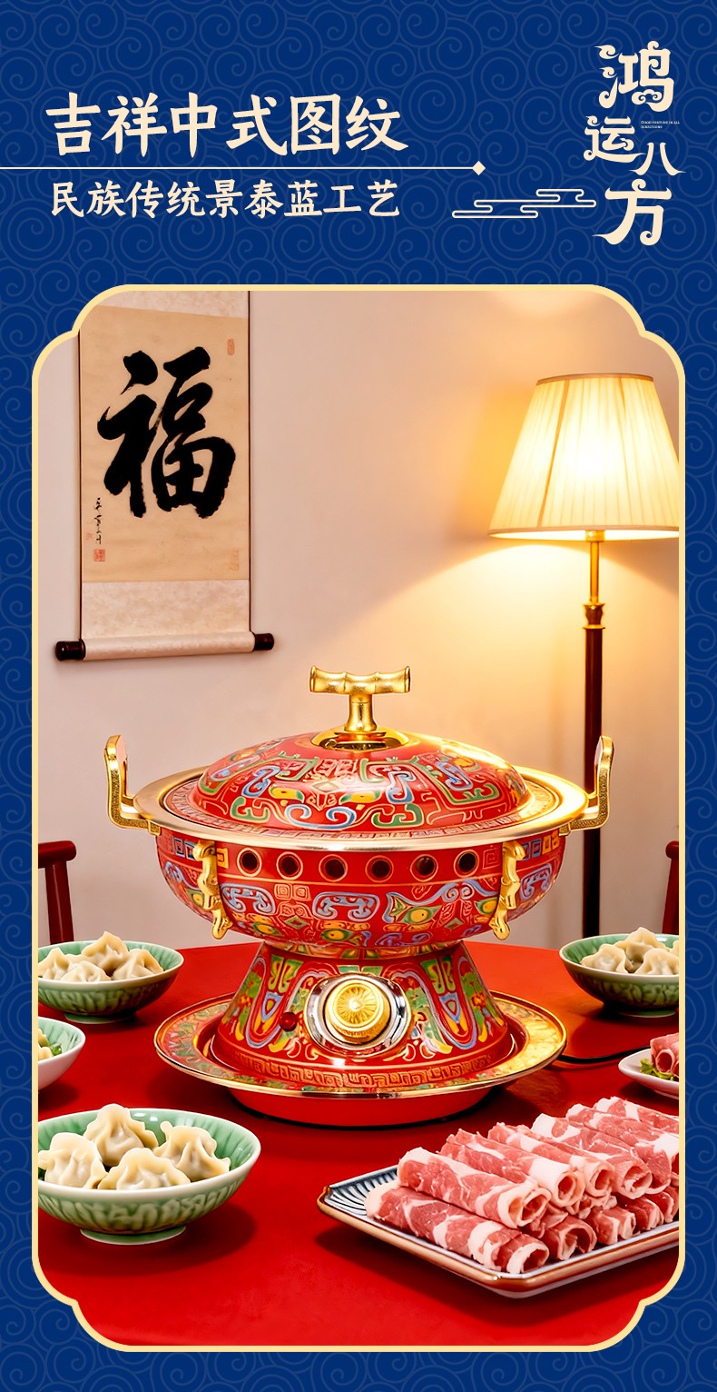 鸿运八方景泰蓝黄铜电火锅,国潮新风尚,尽显东方古典韵味; 吉祥喜庆图纹+景泰蓝工艺,纯正北京味; 铜锅涮肉,保留食物营养,还原美味; 旋钮操作,精准温控,导热快速; 严选纯黄铜原材料,传承匠心工艺,纯手工打造; 纯黄铜材质锅体,补充人体铜元素; 用料扎实,加厚加固,坚固耐用不变形; 防烫把手,内置铆钉固定 ,防漏安心使用。