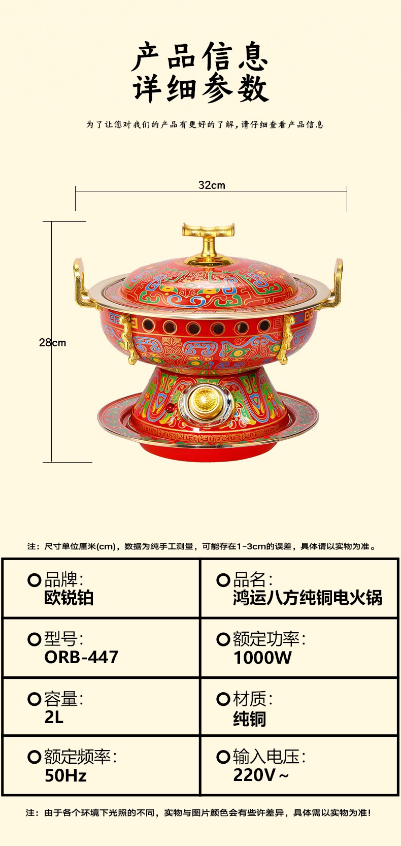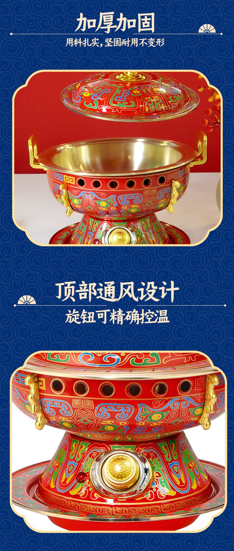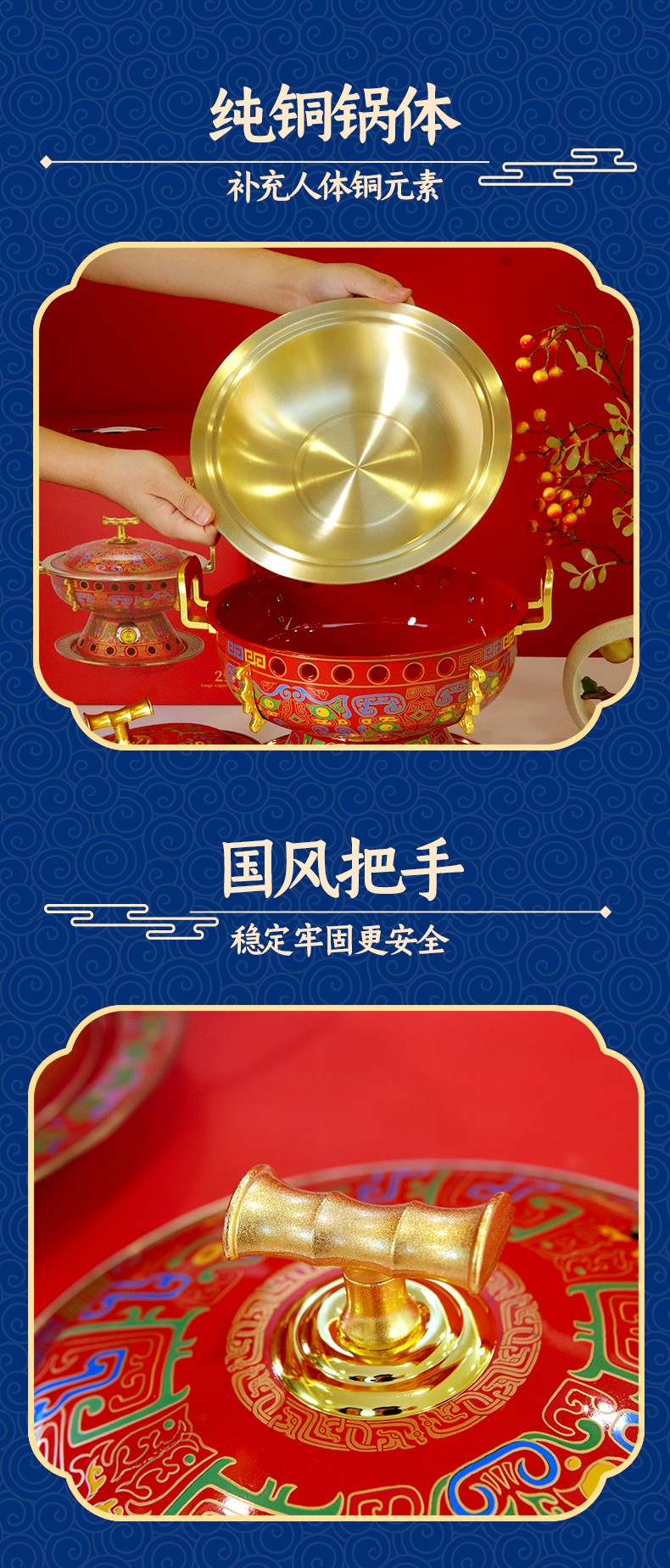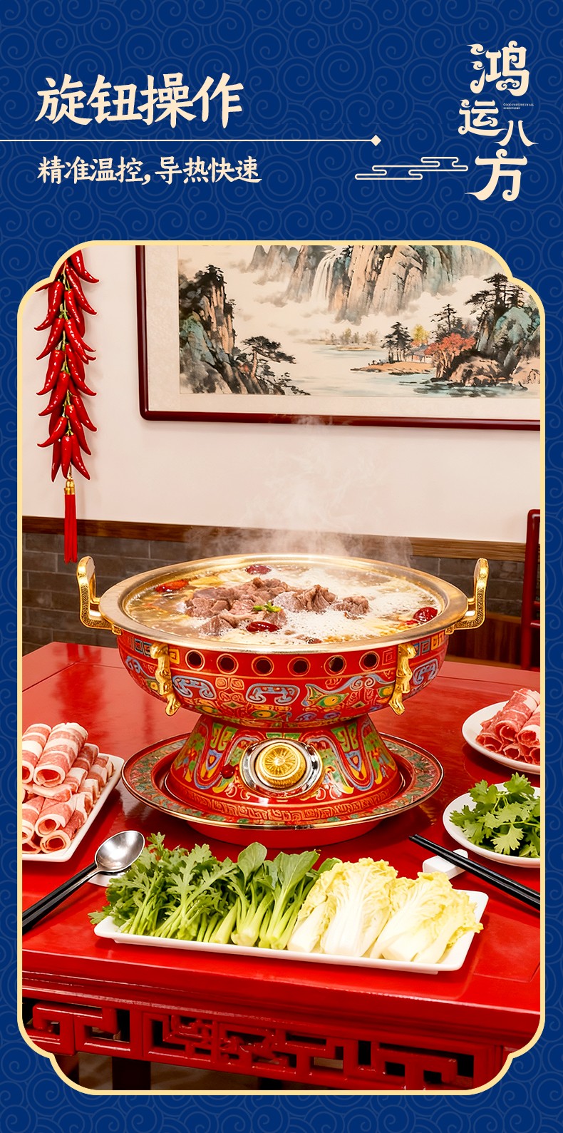 鸿运八方景泰蓝黄铜电火锅,国潮新风尚,尽显东方古典韵味; 吉祥喜庆图纹+景泰蓝工艺,纯正北京味; 铜锅涮肉,保留食物营养,还原美味; 旋钮操作,精准温控,导热快速; 严选纯黄铜原材料,传承匠心工艺,纯手工打造; 纯黄铜材质锅体,补充人体铜元素; 用料扎实,加厚加固,坚固耐用不变形; 防烫把手,内置铆钉固定 ,防漏安心使用。