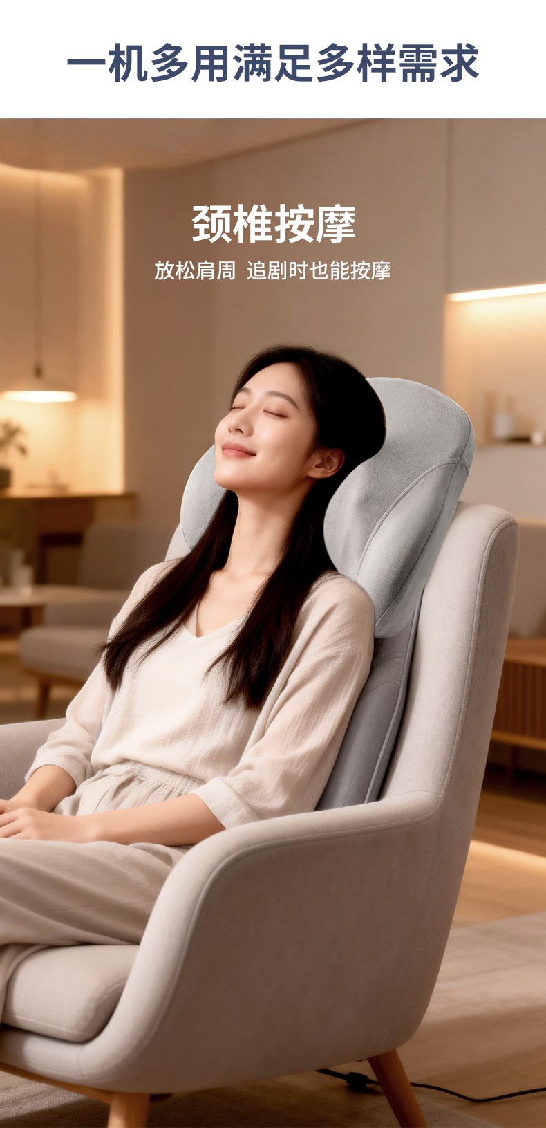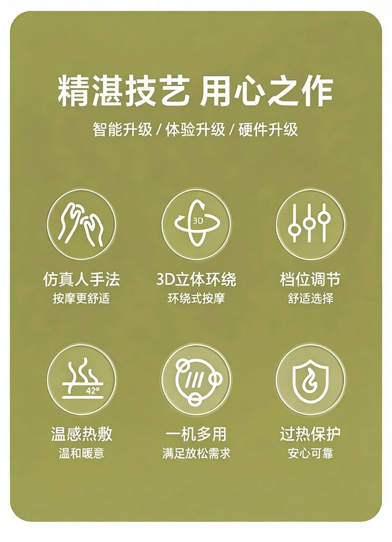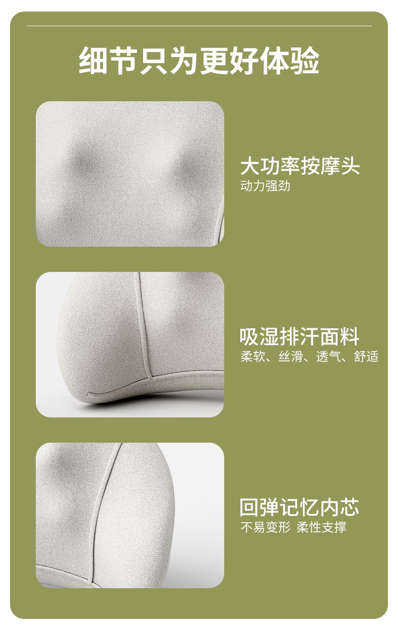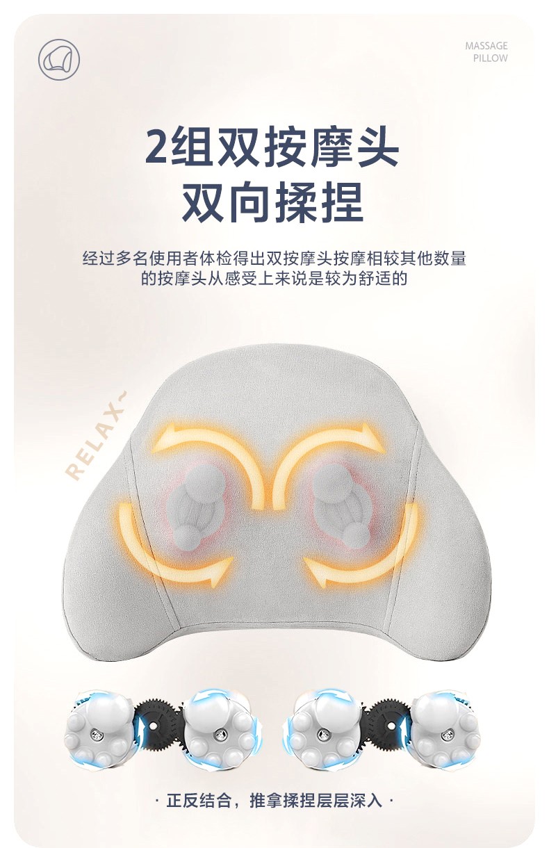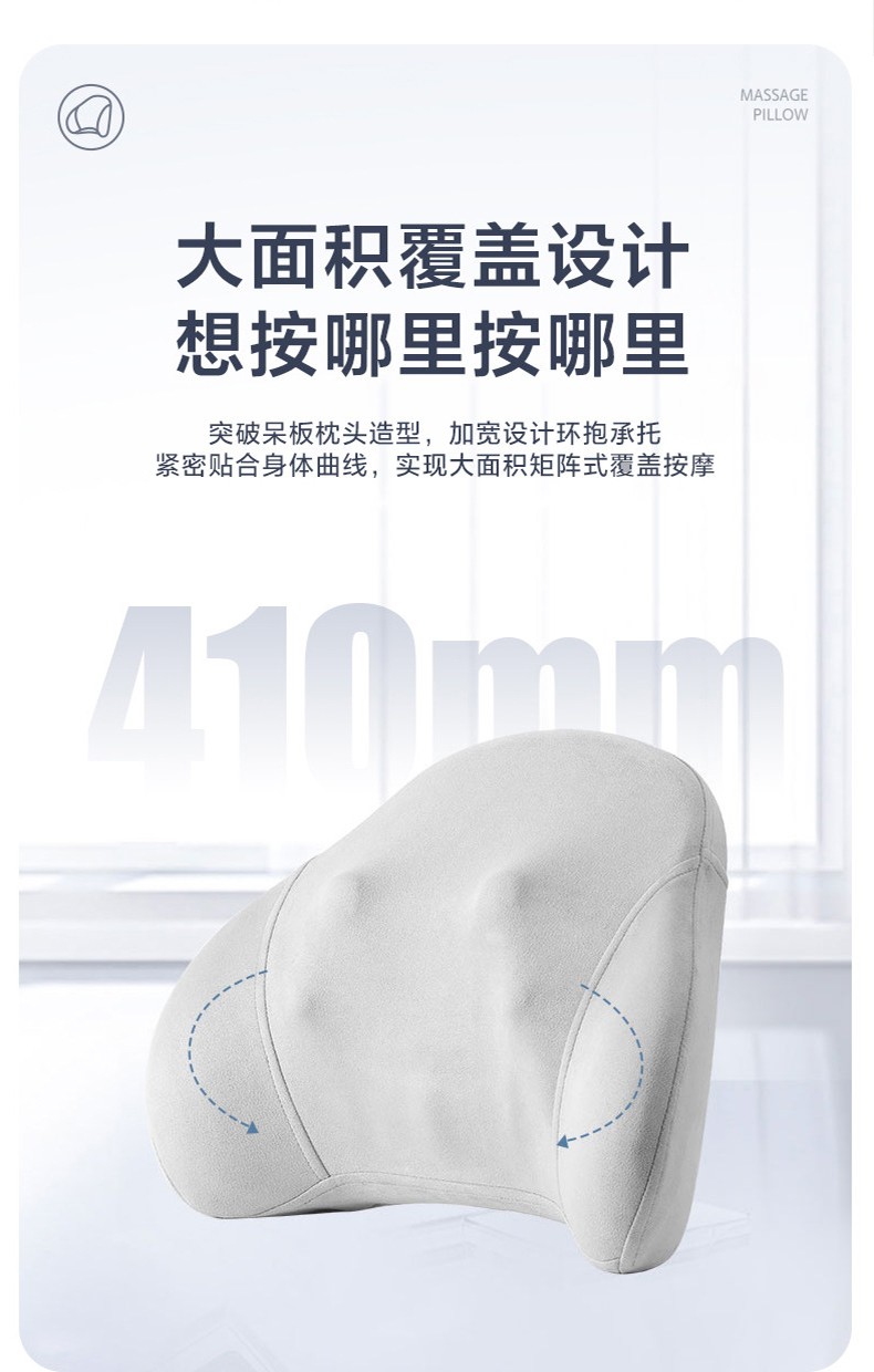 3D立体环绕式按摩,全身各部位适用,人体工学设计; 加宽设计环抱承托,紧密贴合身体曲线,实现大面积矩阵式覆盖按摩; 简易开关/换模式按键;温感热敷,过热保护,安心可靠; 多种拟人按摩,舒缓压力,集揉/捏/推/拿/按/压多种手法于一身; 办公/家居/车载多用途,适用于多种场合; 大功率电机,动力强劲;吸湿排汗柔软、透气面料; 回弹记忆内芯 ,不易变形,柔性支撑。