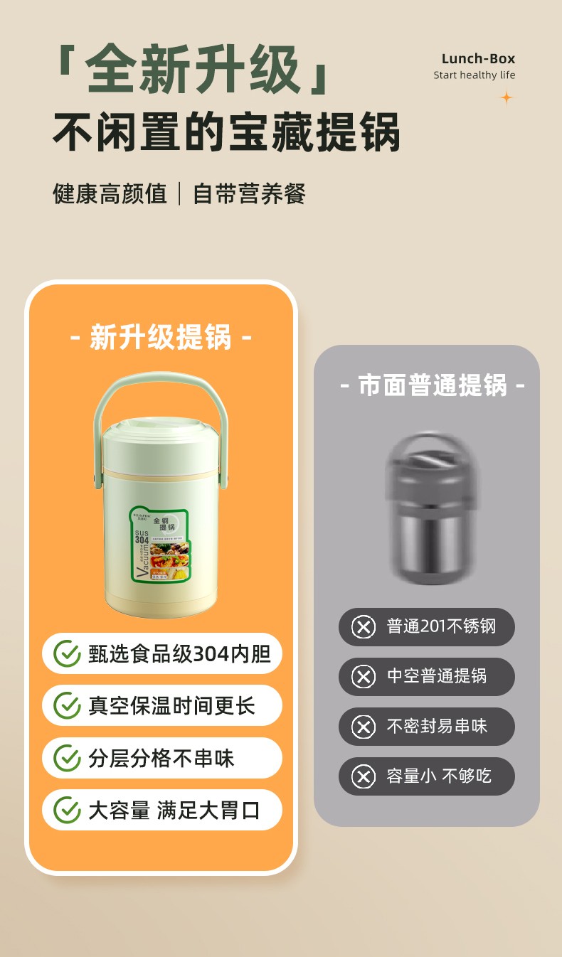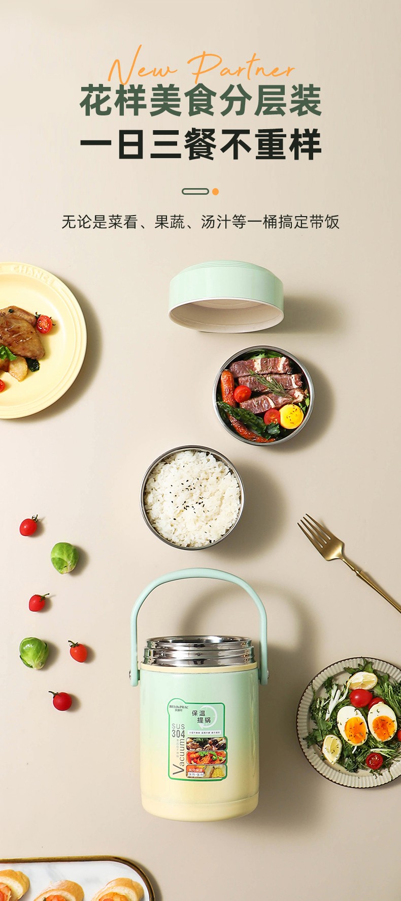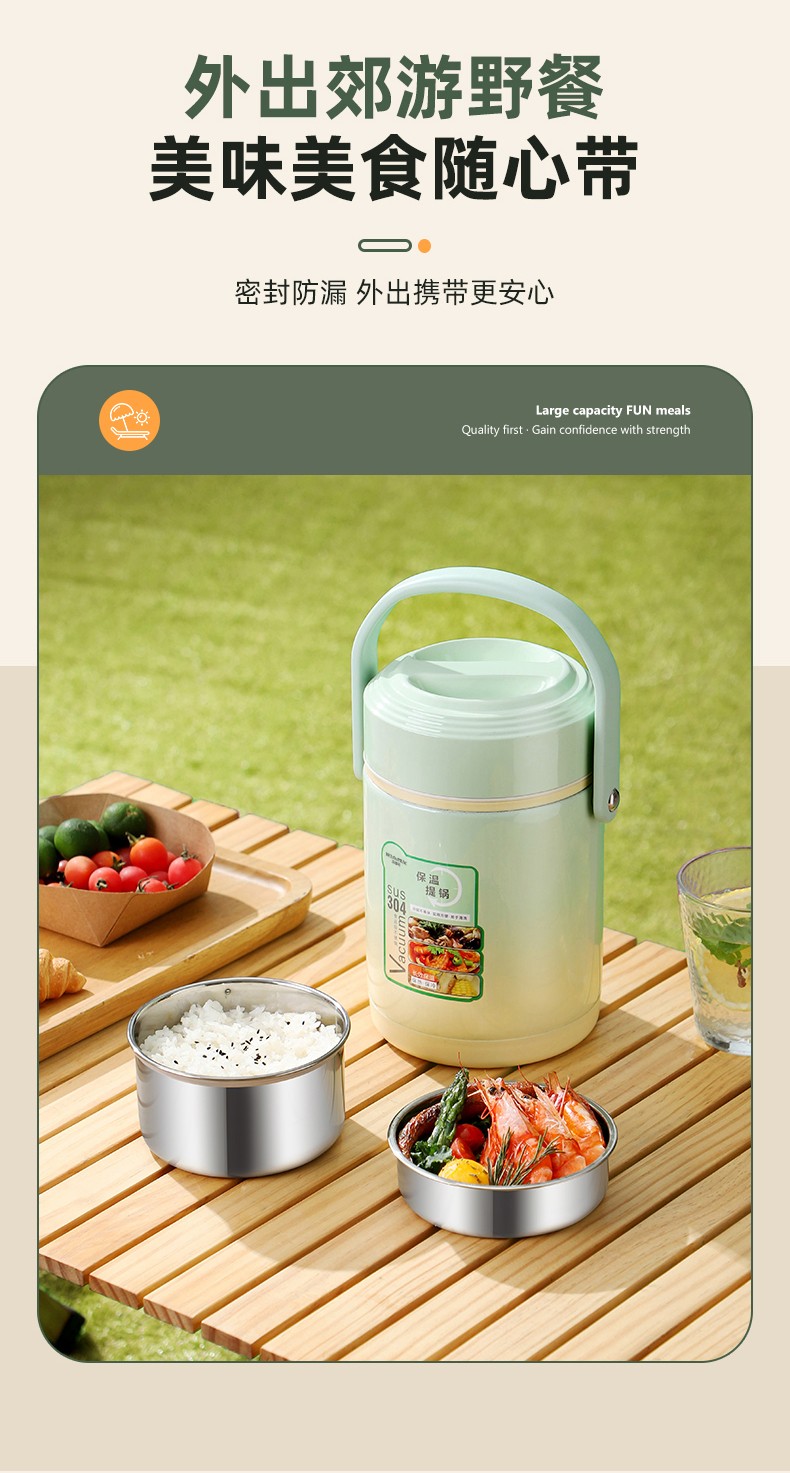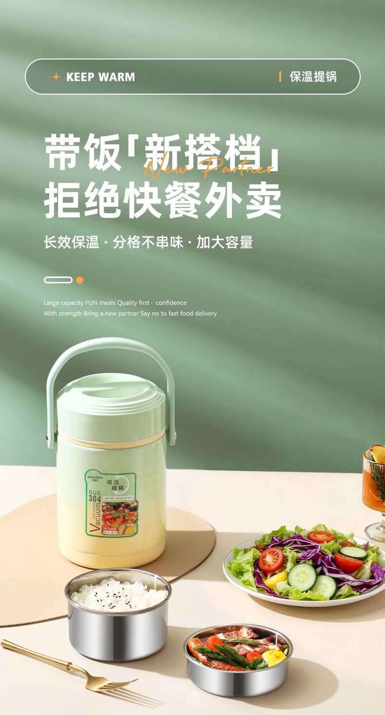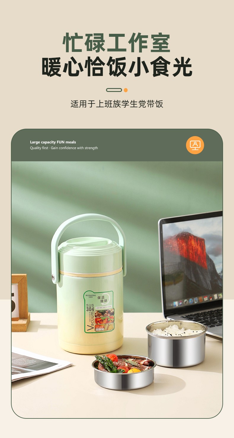 「全新升级」宝藏带饭新搭档,高颜值,告别速食快餐,开启健康生活; 食品级304不锈钢内胆,一日三餐安心享,为家人健康保驾护航; 花样美食独立分装,不串味更美味; 加大容量设计,米饭菜肴,果蔬、营养汤等一桶搞定; 真空长效保温,多层保温减少热量流失,随时吃到热乎饭菜; 密封防漏,倒置也不易洒,外出携带更安心; 新颖渐变双色,分体式可拆卸,底部防滑,便捷提手