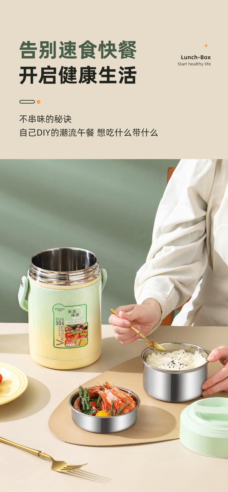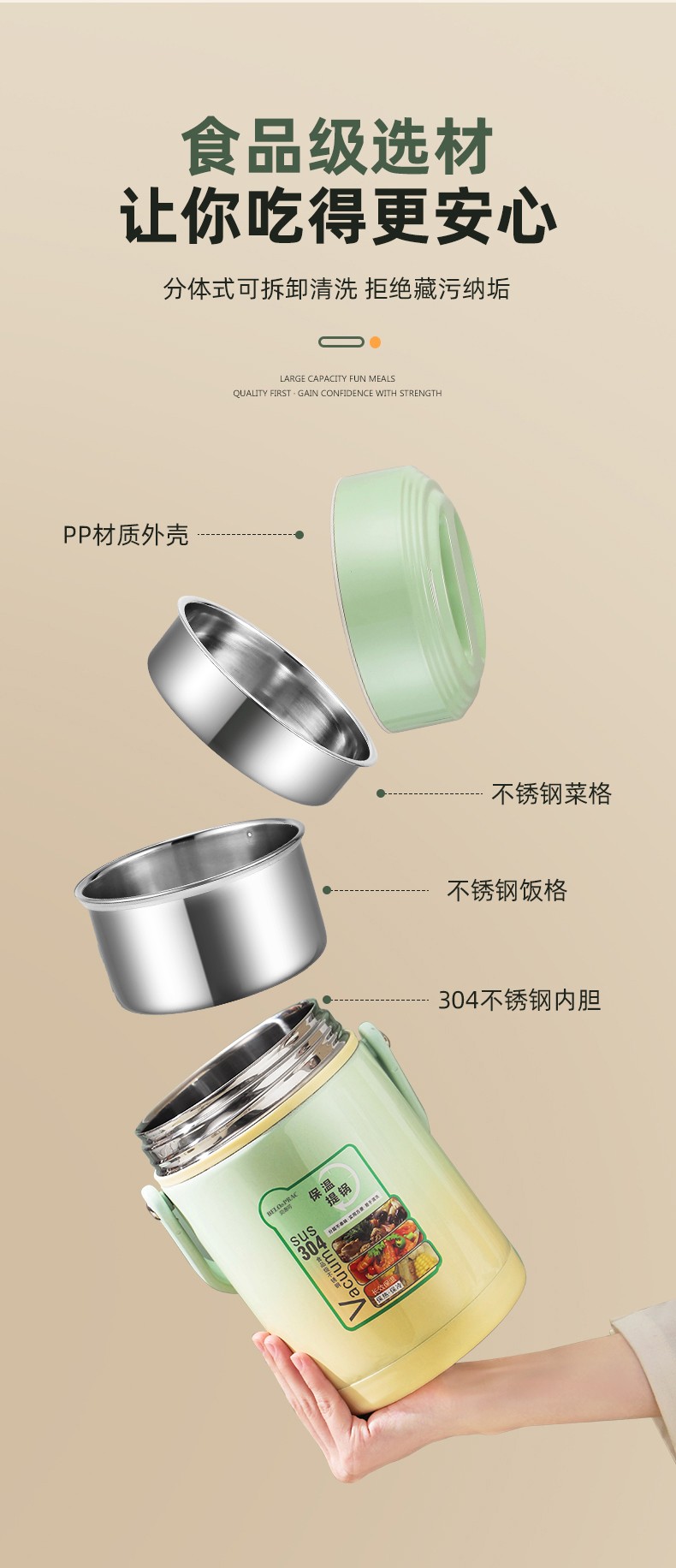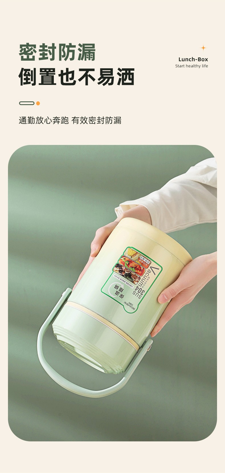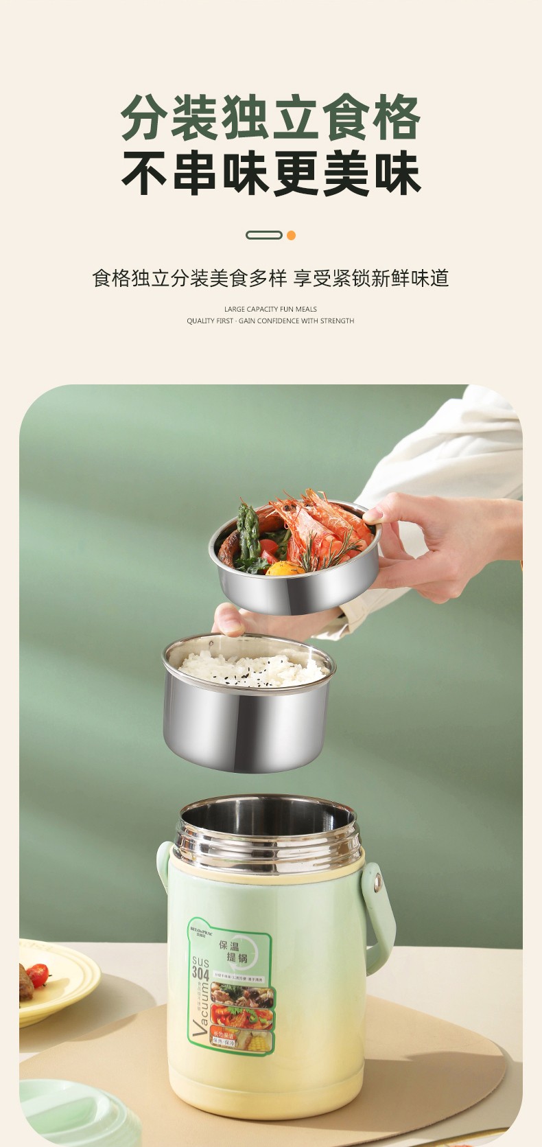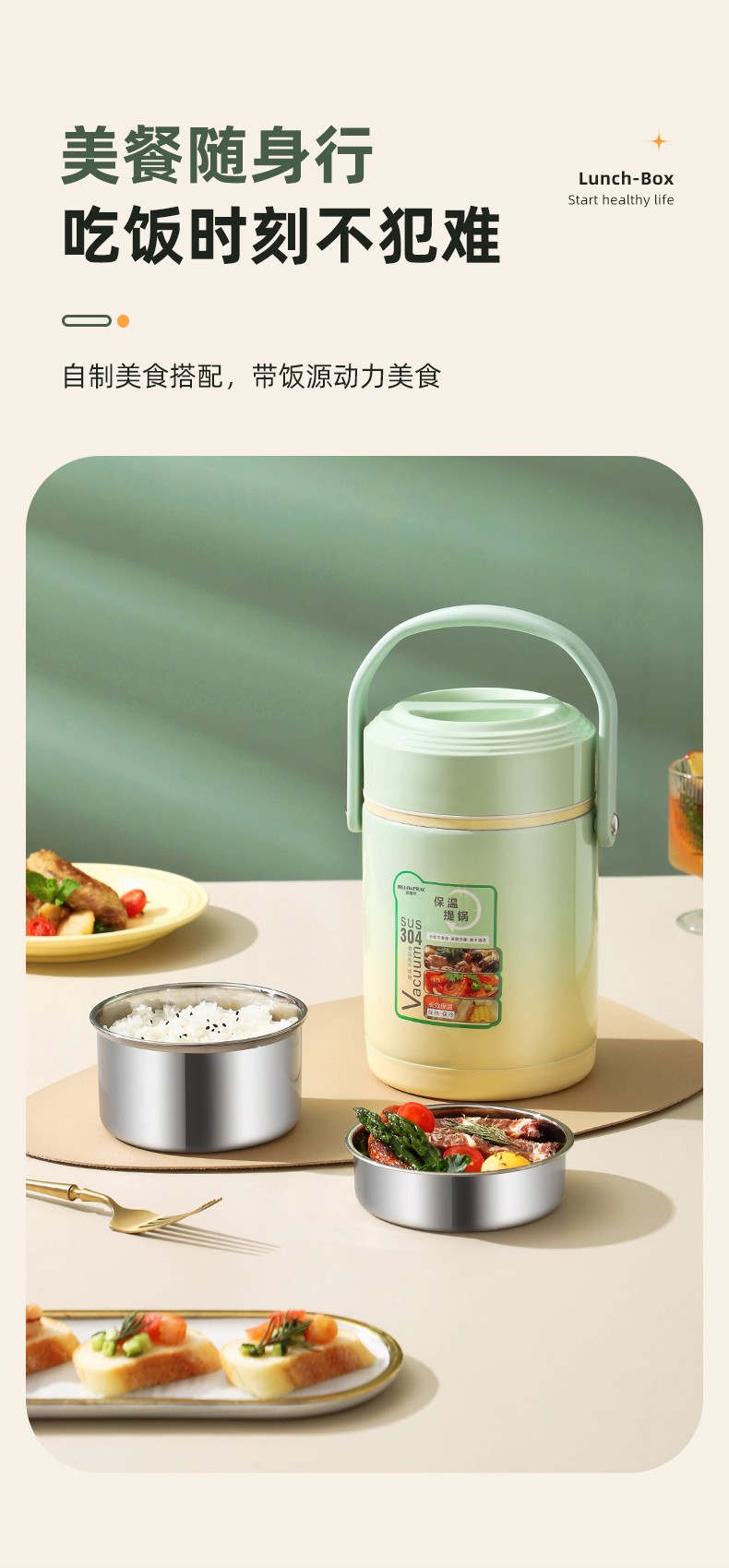 「全新升级」宝藏带饭新搭档,高颜值,告别速食快餐,开启健康生活; 食品级304不锈钢内胆,一日三餐安心享,为家人健康保驾护航; 花样美食独立分装,不串味更美味; 加大容量设计,米饭菜肴,果蔬、营养汤等一桶搞定; 真空长效保温,多层保温减少热量流失,随时吃到热乎饭菜; 密封防漏,倒置也不易洒,外出携带更安心; 新颖渐变双色,分体式可拆卸,底部防滑,便捷提手