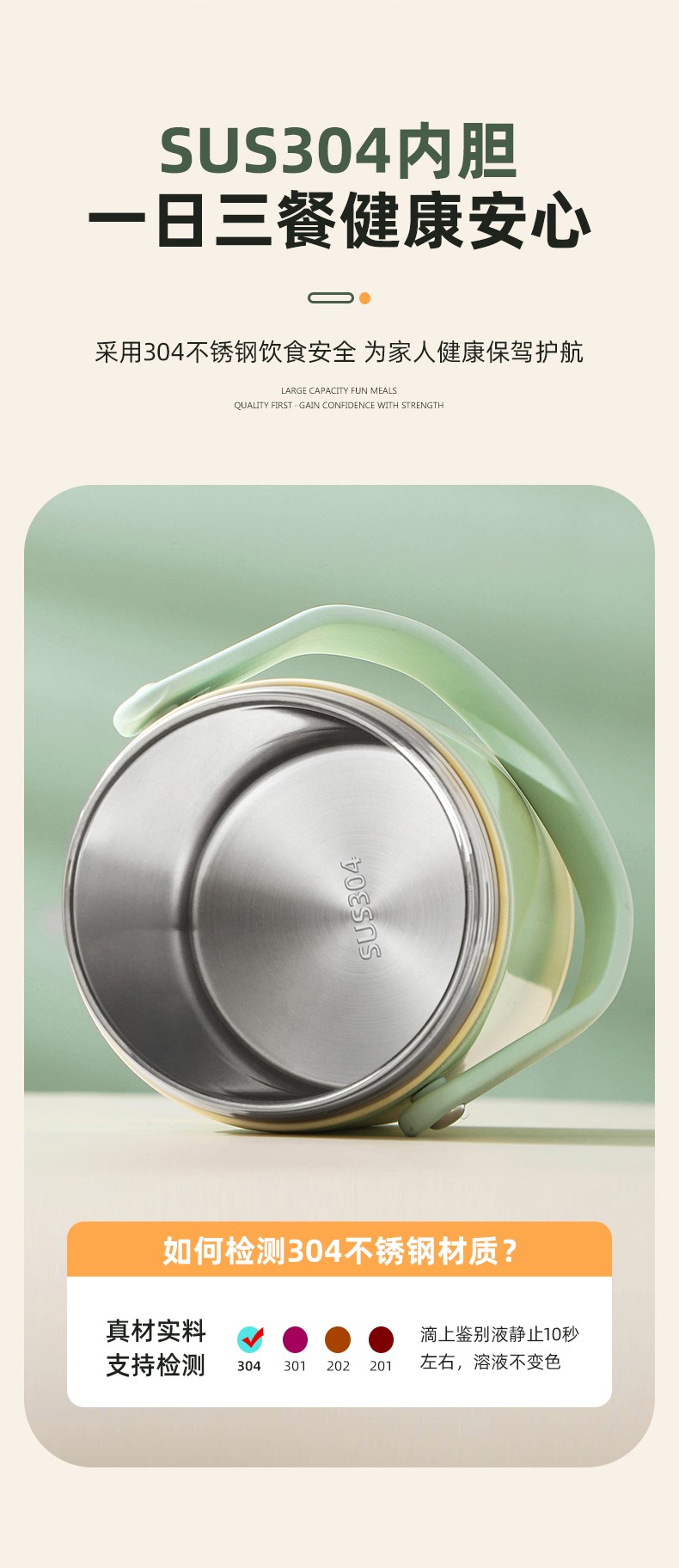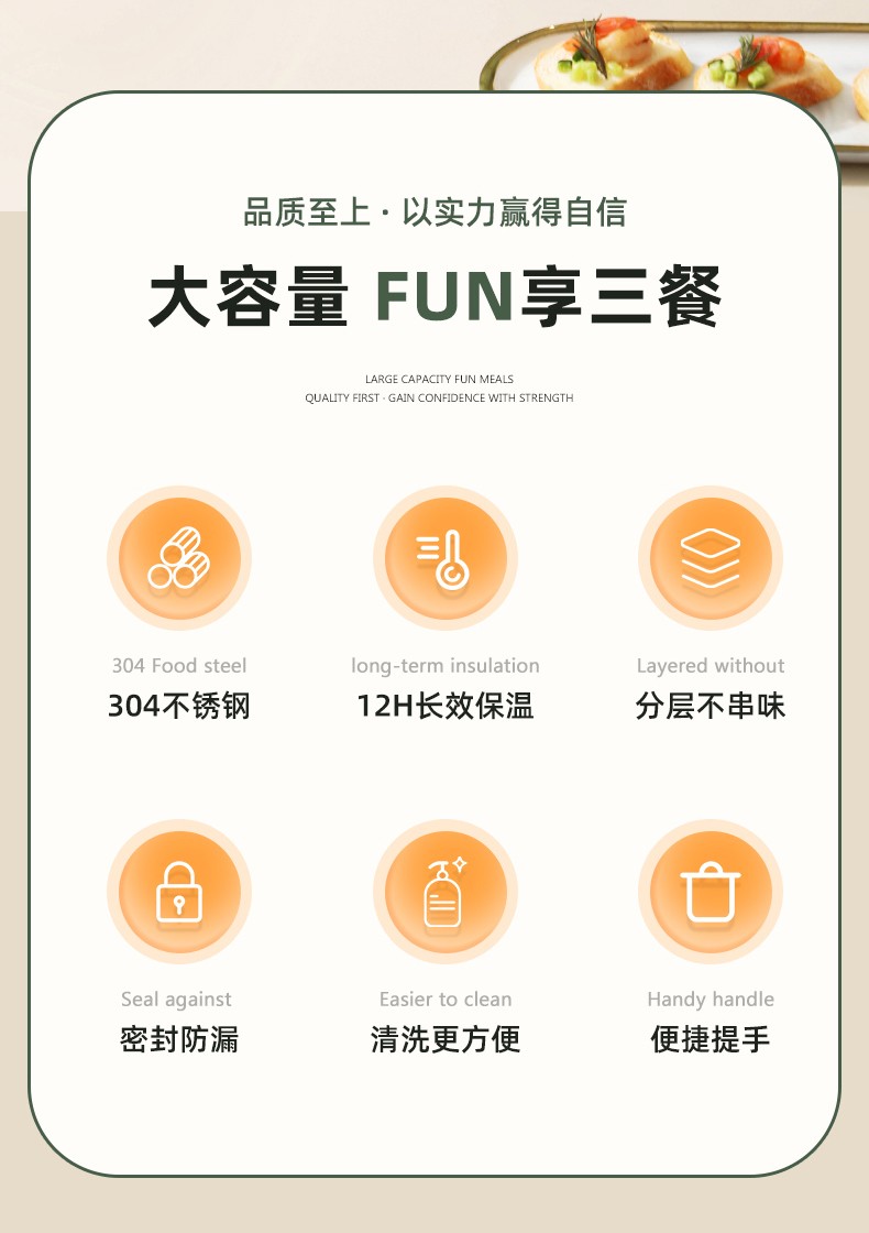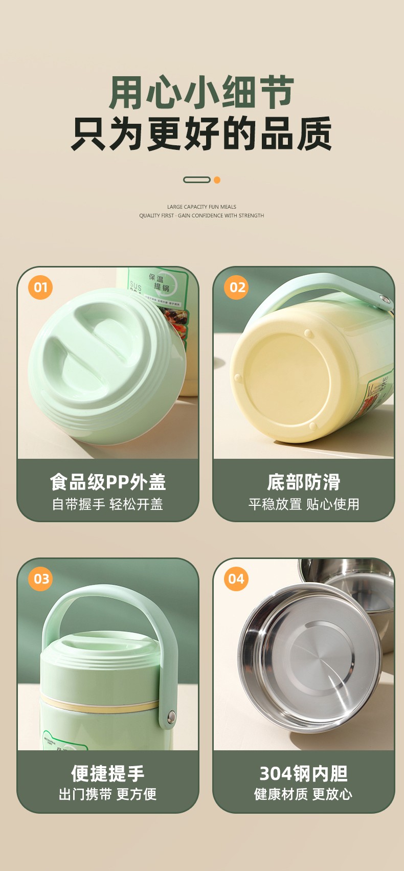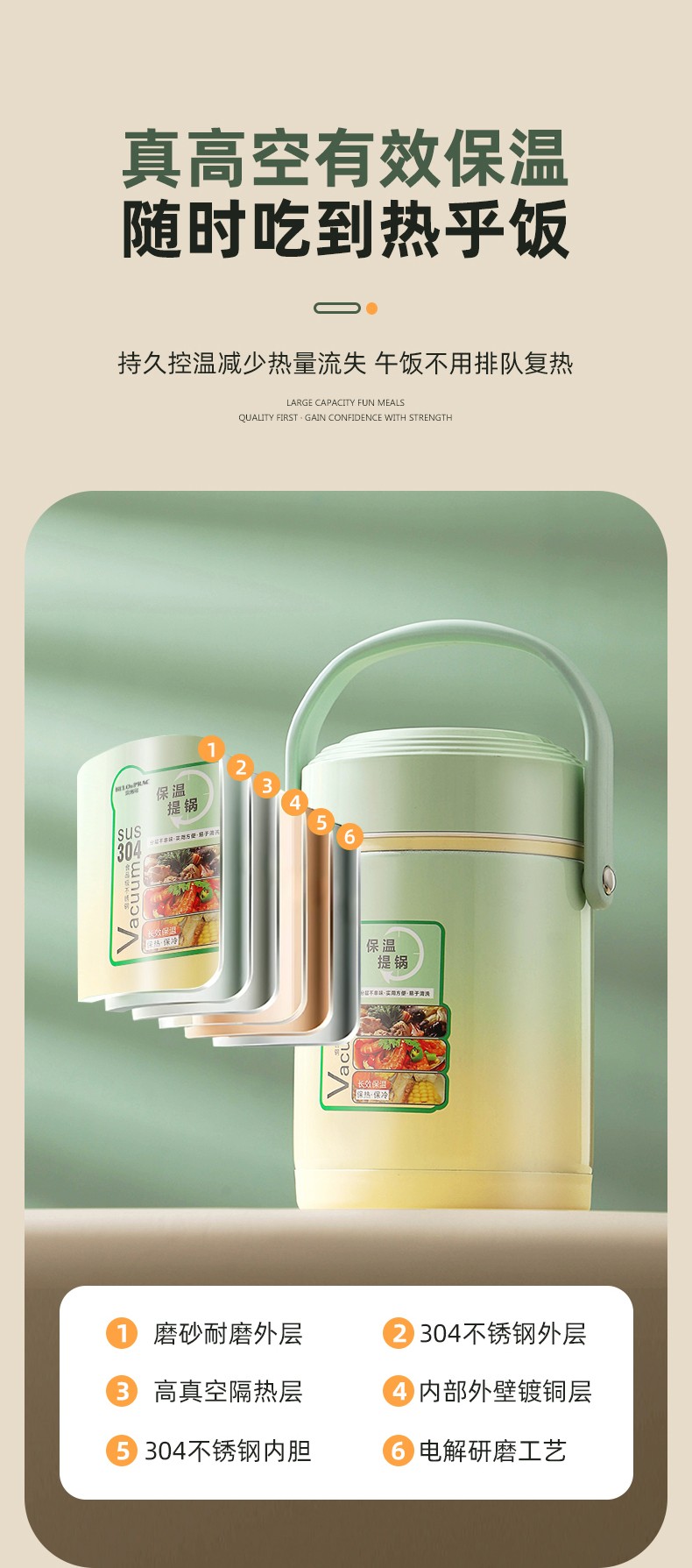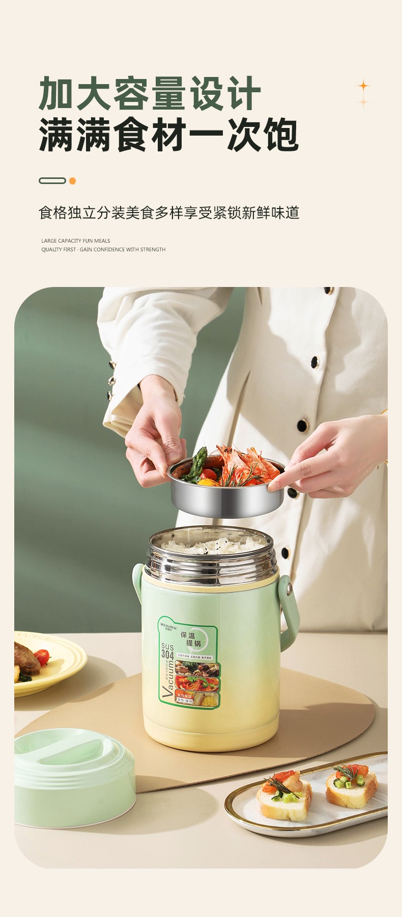「全新升级」宝藏带饭新搭档,高颜值,告别速食快餐,开启健康生活; 食品级304不锈钢内胆,一日三餐安心享,为家人健康保驾护航; 花样美食独立分装,不串味更美味; 加大容量设计,米饭菜肴,果蔬、营养汤等一桶搞定; 真空长效保温,多层保温减少热量流失,随时吃到热乎饭菜; 密封防漏,倒置也不易洒,外出携带更安心; 新颖渐变双色,分体式可拆卸,底部防滑,便捷提手